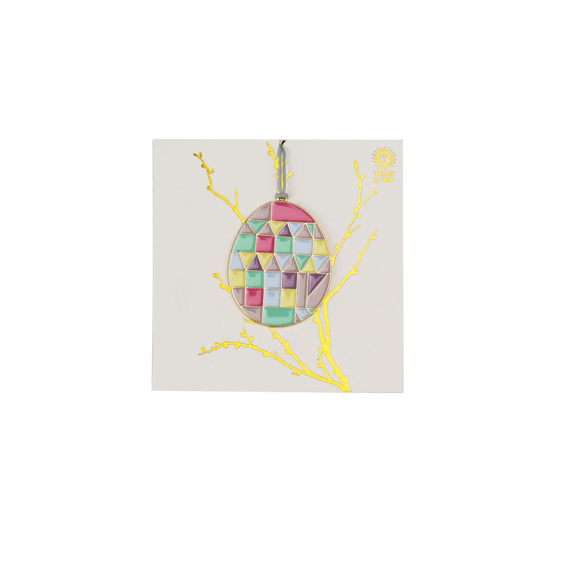 Flacher Anhänger in Ei-Form aus glänzendem goldenem Metall und zartem farbigen Emaille-Lack, an Wachsband. Inklusive kleiner Karte für nette Botschaften.