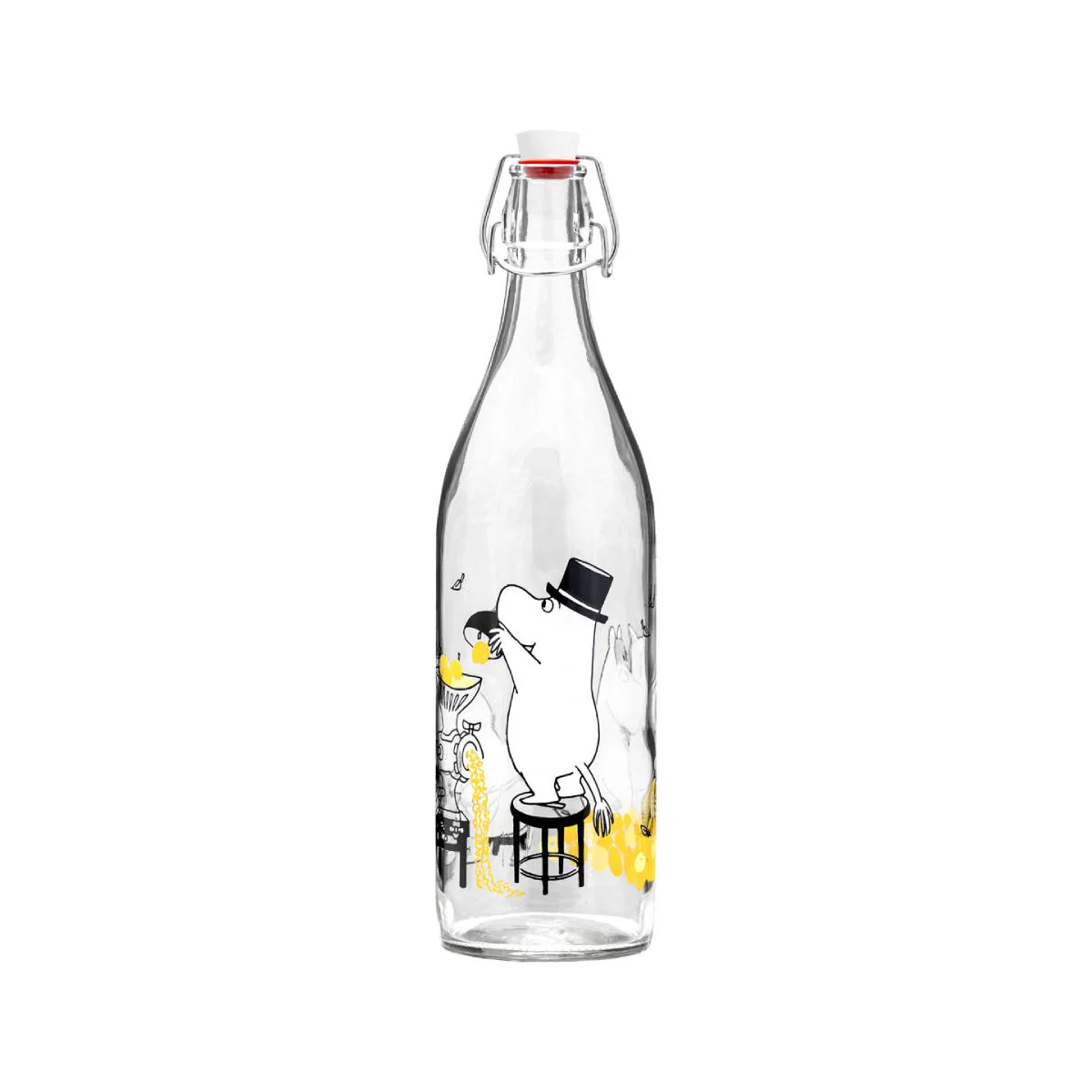 Glasflasche, bunt bedruckt und mit einem patentierten Verschluss der ein Auslaufen verhindert.