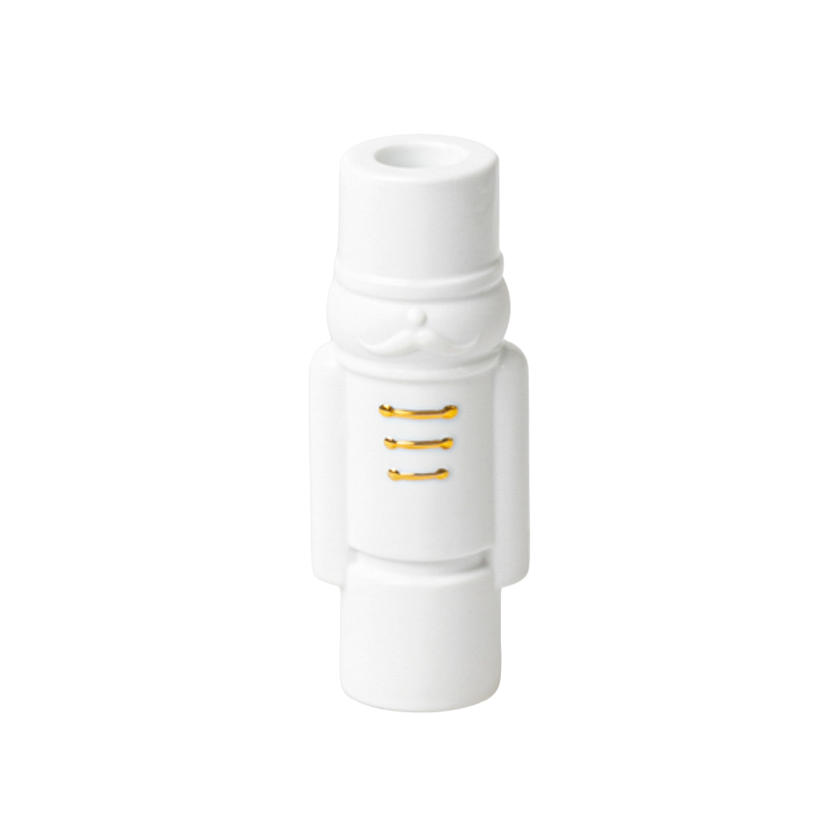 Ein kleiner Nußknacker als Kerzenleuchter aus weißem mattem Porzellan mit Relief und goldener Glasur.