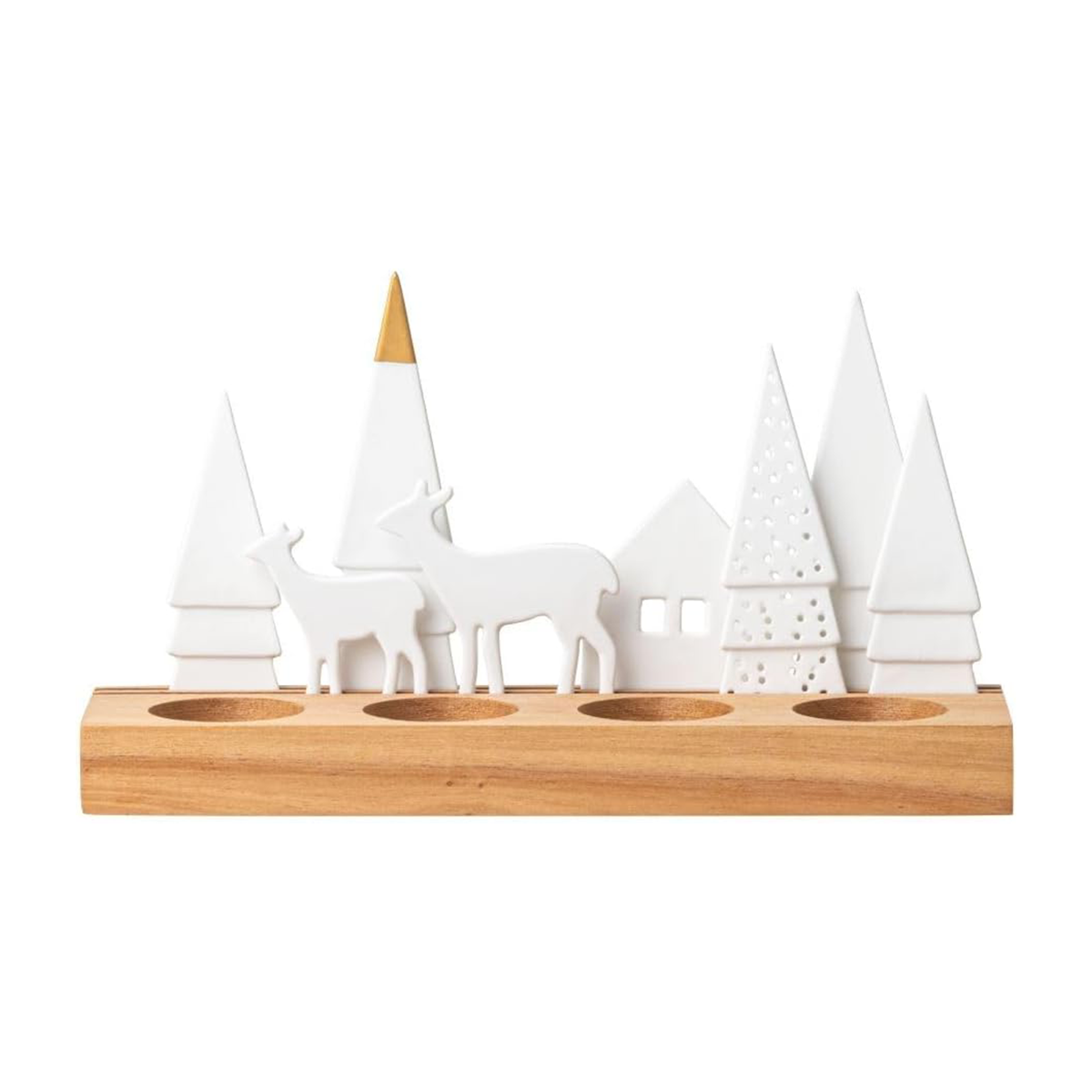 Teelichthalter aus Akazienholz mit mattem Porzellanelementen, teilweise mit Goldglasur und Lochmustern für 4 kleine Teelichter.