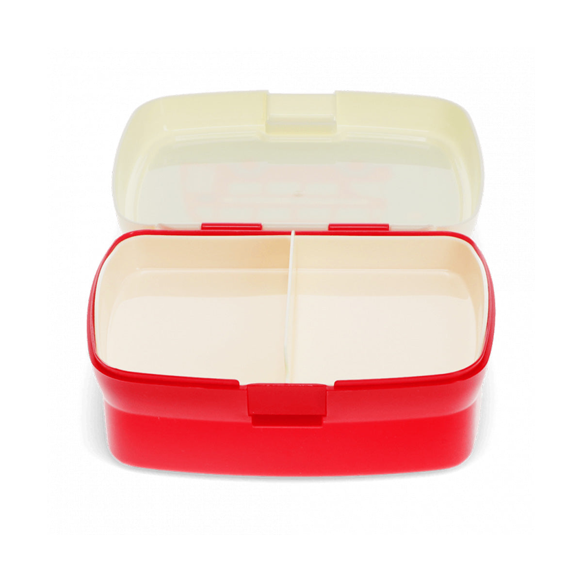 Eine Lunchbox mit herausnehmbarem Fach und Klappdeckel mit einem stilisierten Aufdruck eines legendären Routemaster-Busses auf der Vorderseite. Perfekt für Kinder, zum Mitnehmen in die Schule oder zum Picknick.