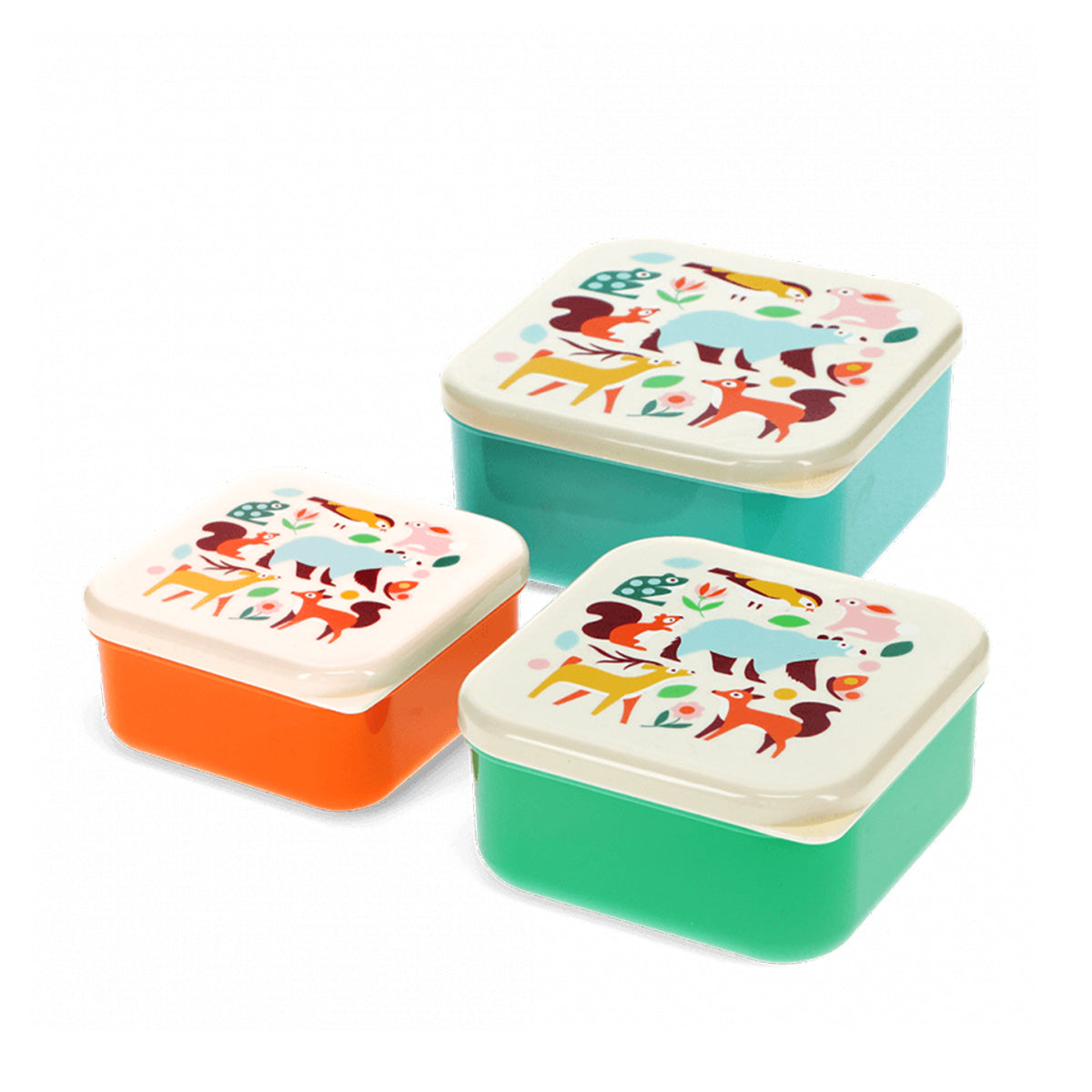 Ein Set mit drei Snackdosen, die Deckel sind geschmückt mit Tiermotiven aus unserem beliebten Woodland - Design. Ideal für Snacks und kleine Mahlzeiten unterwegs.