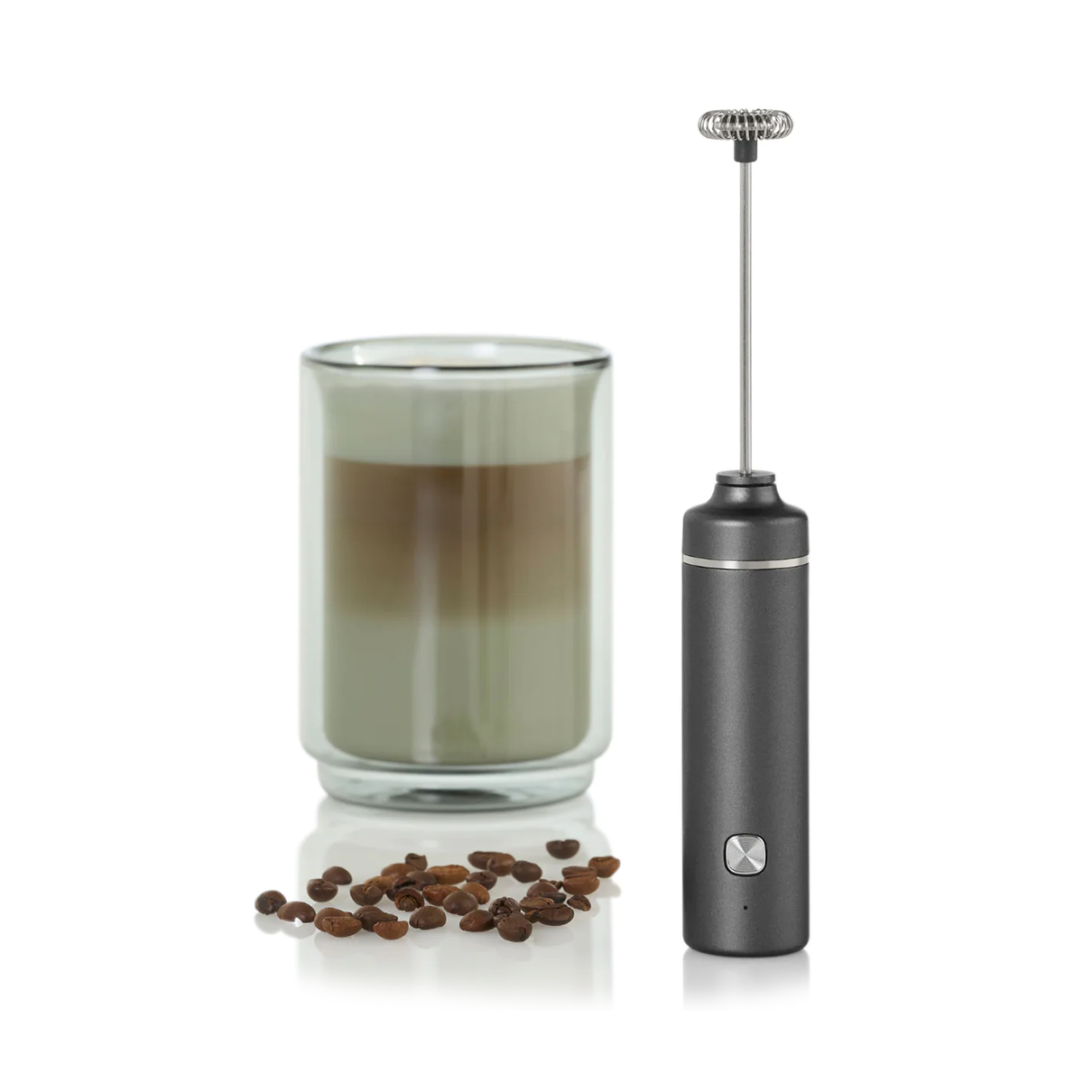 Der Milch- und Saucenschäumer Moro in edlem Dark Grey kombiniert stilvolle Optik mit durchdachter Technik. Gefertigt aus strapazierfähigem Kunststoff und Edelstahl, überzeugt er durch Langlebigkeit und ein modernes Erscheinungsbild. Der integrierte Lithium-Akku ermöglicht flexiblen Einsatz ohne Kabel und wird über das beiliegende USB-C-Ladekabel komfortabel aufgeladen. Eine dezente Anzeige zeigt den Ladezustand an. Mit nur einem Knopfdruck sorgt der kraftvolle Motor mit 10.000 Umdrehungen pro Minute für luftigen, cremigen Milchschaum – ideal für Kaffeespezialitäten oder heiße Schokolade. Die robuste Welle überträgt die Leistung gleichmäßig, während der abnehmbare und spülmaschinengeeignete Quirl eine unkomplizierte Reinigung garantiert. Auch für die Zubereitung feiner Vinaigrettes, delikater Saucen oder aromatischer Cocktails ist der Moro bestens geeignet.