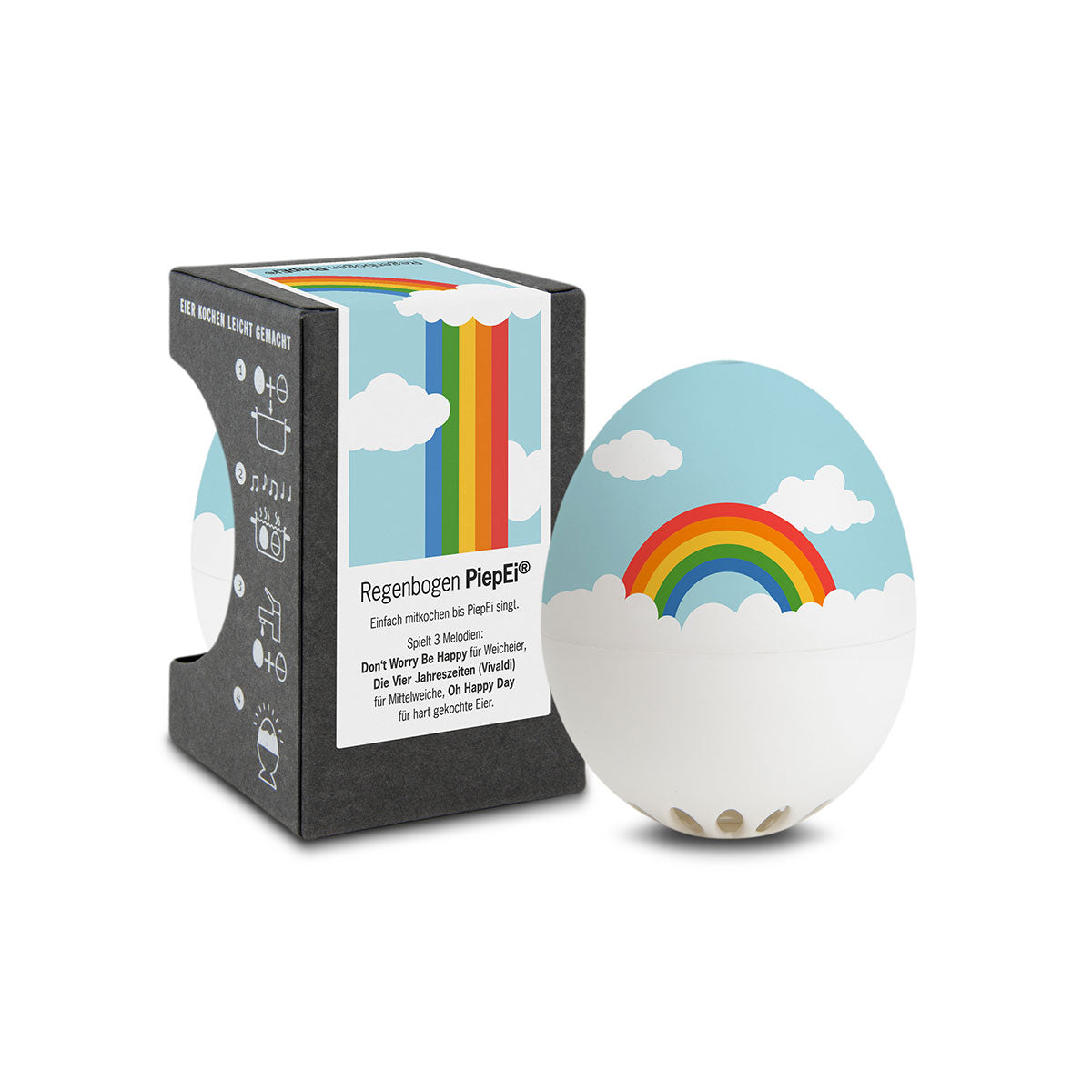 Zu weich, zu hart aber nie auf den Punkt. Perfekt gekochte Eier sind eine Wissenschaft für sich. Für das Regenbogen PiepEi aber kein problem! Das Regenbogen PiepEi spielt drei verschiedene Melodien für drei Härtegrade: