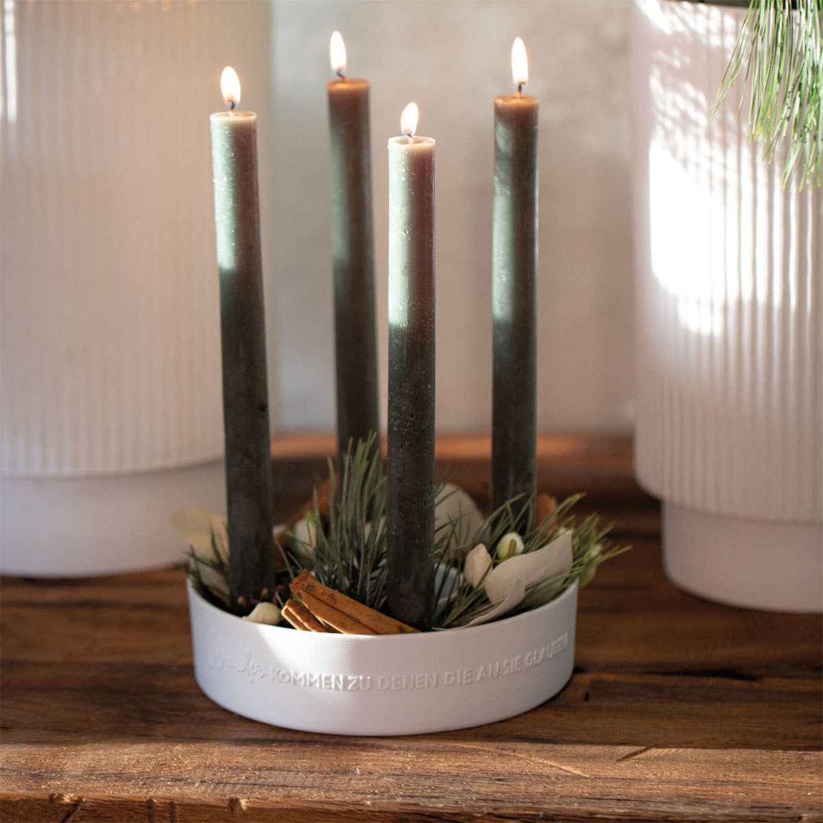 Porzellankrank aus weißem Porzellan mit Relief und 4 Kerzenhalter für Stabkerzen, innen glasiert & außen unglassiert.