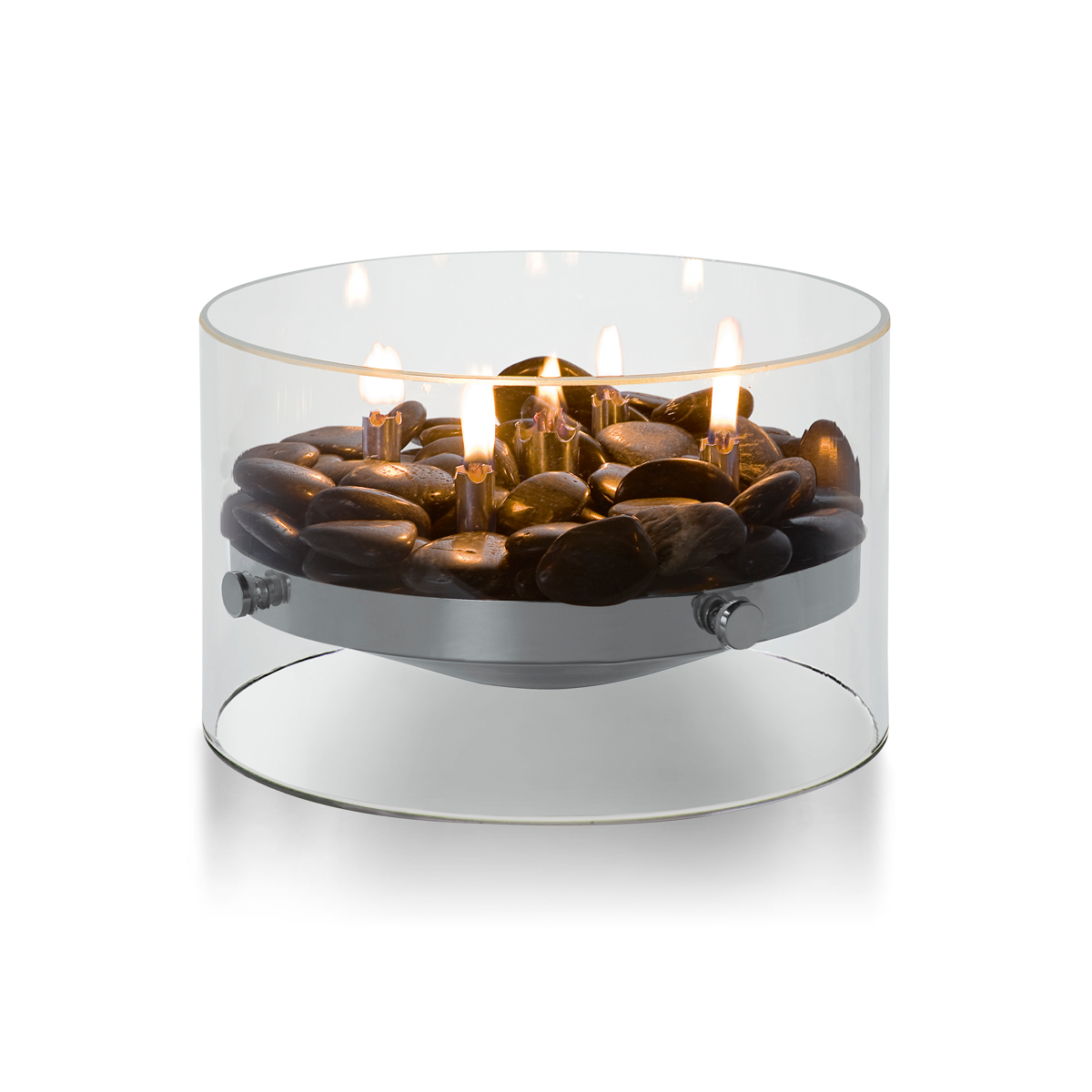 Der ausgeklügelte Tischkamin FIRE verspricht romantische Abende im eigenen Heim. Durch den Mund geblasenen Glasring und die an vier Punkten fixierte Feuerschale wirkt es, als ob die Flammen frei in der Luft schweben. Das Gefäß selbst wird mit duftneutralem Lampenöl gefüllt, welches über fünf Dochte an der Oberfläche der dunklen Kiesel ein sanft schimmerndes Feuer erstrahlen lässt.